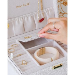La boîte à bijoux Denise de Maison Scarlett est la plus grande de la collection, offrant de nombreux emplacements modulables pour ranger bagues, colliers, bracelets et boucles d’oreilles en toute organisation.
