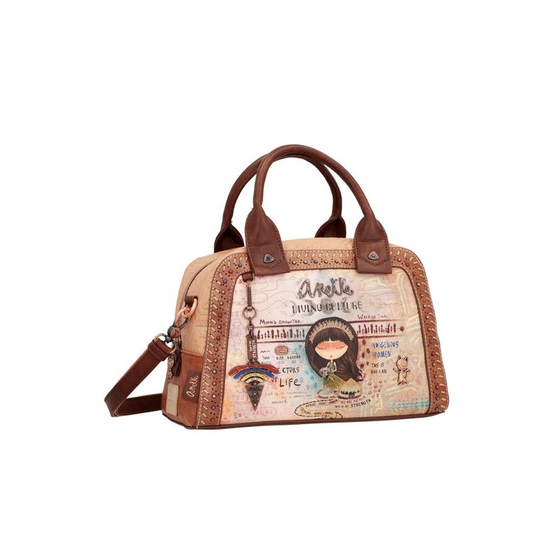Avec ses motifs brodés et ses phrases inspirantes, ce sac bowling se décline dans des tons bruns, rougeâtres, ocre et bleus, dans lesquels sont représentés divers éléments culturels de l'Amazonie.