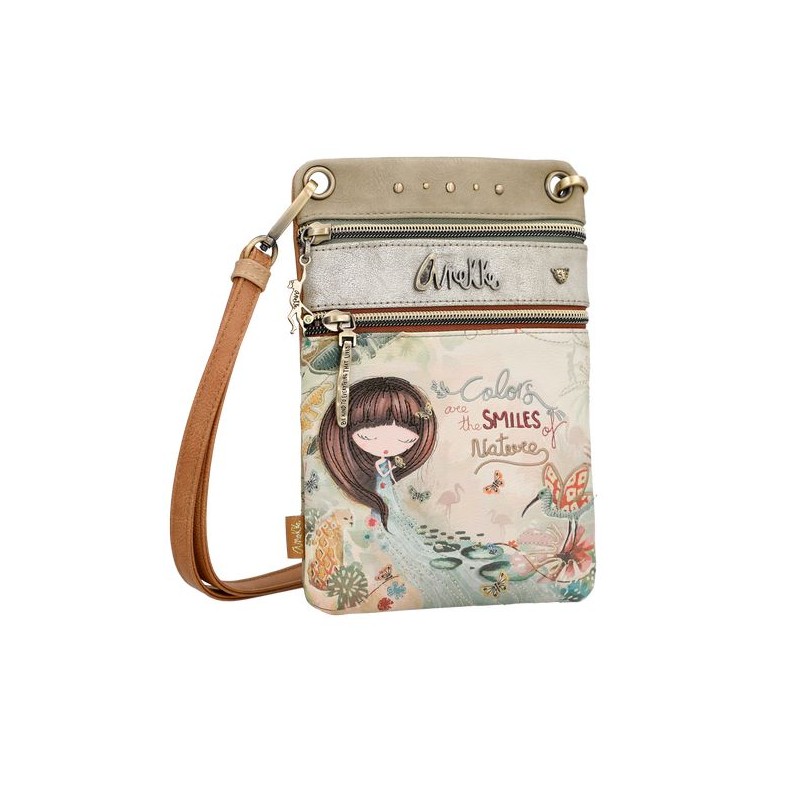 La face avant de ce sac, dans un style aquarelle, se décline dans les tons vert, terracotta et ocre, et montre Anekke vêtue d'une robe qui se confond avec le fleuve Amazone, symbolisant sa connexion avec la Nature.