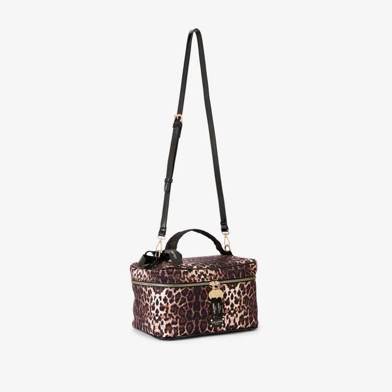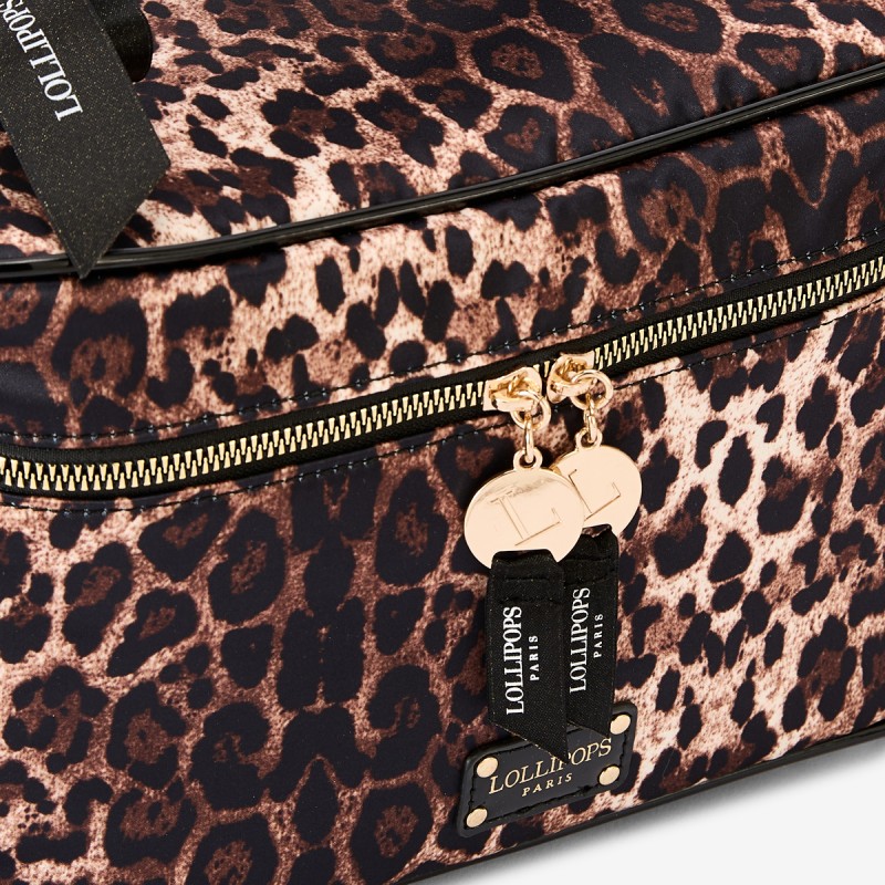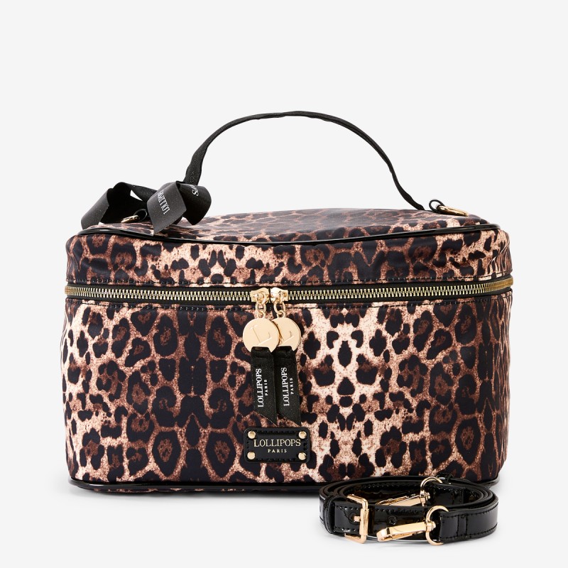 Le grand vanity Rachel L de Lollipops combine transparence moderne et finitions noires élégantes, avec une poignée pratique et une bandoulière amovible et réglable. Il inclut trousses zippées en tissu doré et léopard ainsi qu’un petit vanity plat assorti, alliant organisation et style tendance pour vos déplacements.